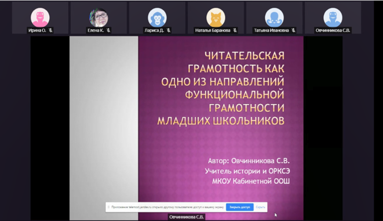 02 ноября 2021 года состоялся методический семинар для учителей начальных классов, ОРКСЭ и ОДНКНР, воспитателей ГПД в онлайн-формате на платформе Яндекс.Телемост Тема: «Система работы учителя начальных классов, ОРКСЭ и ОДНКНР, воспитателей ГПД по формированию функциональной грамотности» В данном мероприятии приняли участие 39 педагогов из 16 школ района.