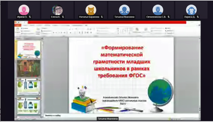 1. Система работы учителя по формированию функциональной грамотности. Осечкова И.Г., методист МКОУ ДО ММЦ 2. Читательская грамотность как одно из направлений функциональной грамотности младших школьников. Овчинникова С.В., руководитель ММО преподавателей ОРКСЭ и ОДНКНР 3. Развитие естественнонаучной грамотности в начальной школе: первые шаги. Дятлова Л.Г., руководитель ММО воспитателей группы продленного дня. 4. Формирование математической грамотности младших школьников. Кожевникова Т.И., руководитель ММО учителей начальных классов. 5. Развитие познавательных способностей младших школьников на уроках и во внеурочное время в условиях реализации ФГОС. Семенюк Г. Е., учитель начальных классов МКОУ Иткульская СОШ